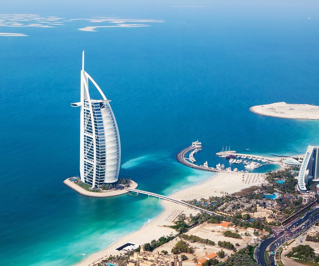ξενοδοχείο 7 αστέρων και μοναδικό στον κόσμο Burj Al Arab. Το ξενοδοχείο έχει το σχήμα ενός ιστίου καραβιού και αποτελεί αρχιτεκτονικό σύμβολο της πολυτέλειας και της καινοτομίας.